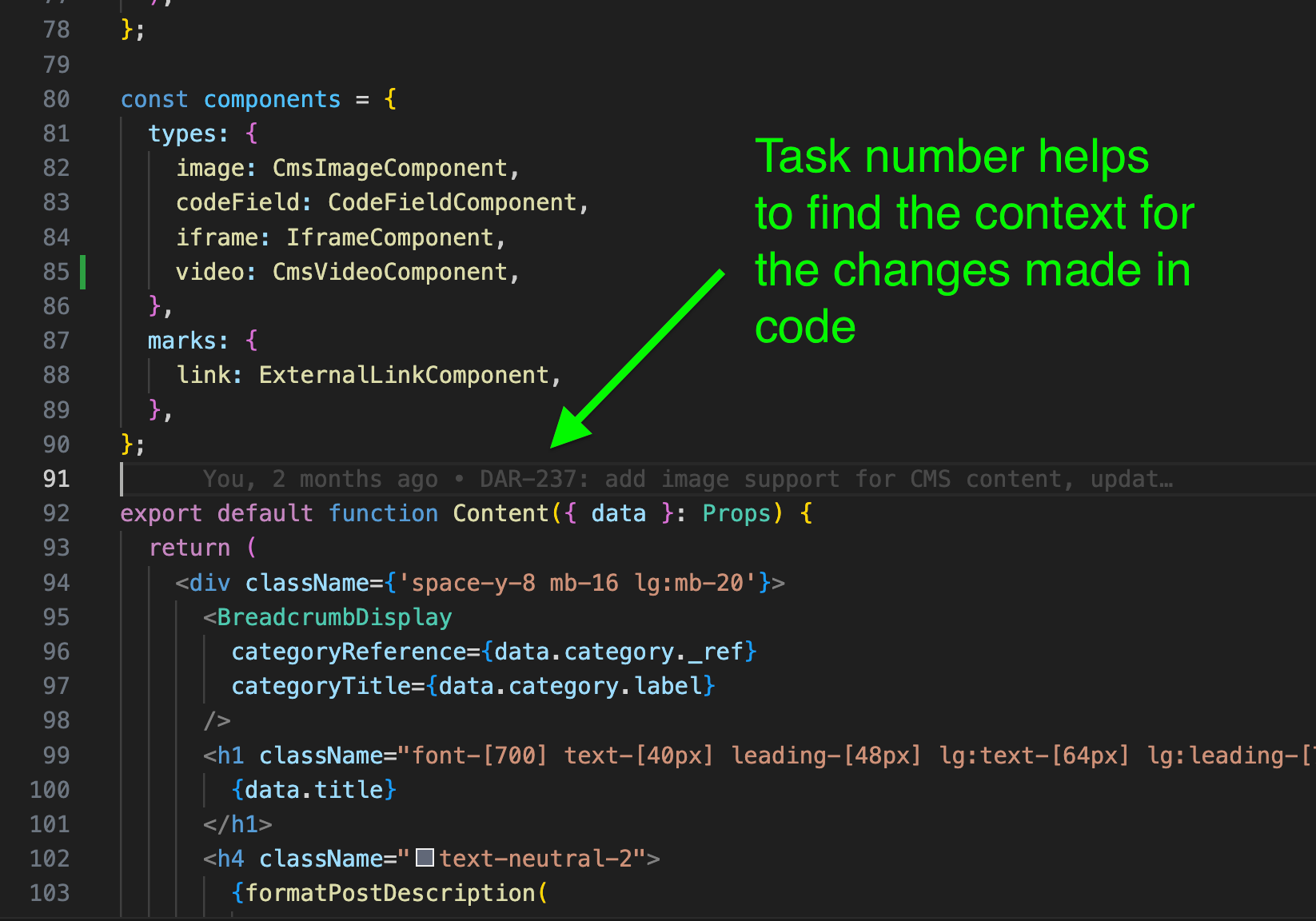 Adding task numbers to branch names and commits is a powerful way to document the code changes because future developers can find the task in question.