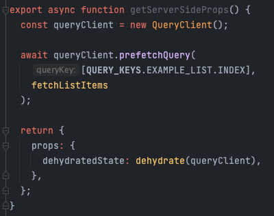The screenshot above shows a getServerSideProps function that fetches data on the server and passes it to the page component via the dehydratedState prop.
