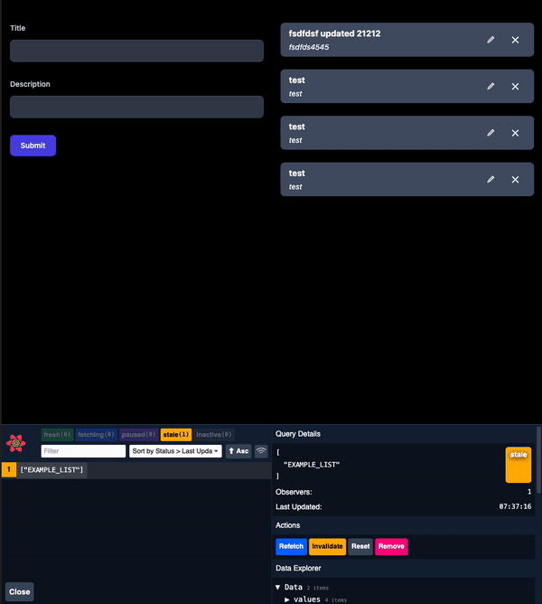 In the screenshot above, you can see an example of a delete list item mutation. When the delete button is clicked, the mutation is triggered, and upon success, the query cache is invalidated, causing the list to refetch.